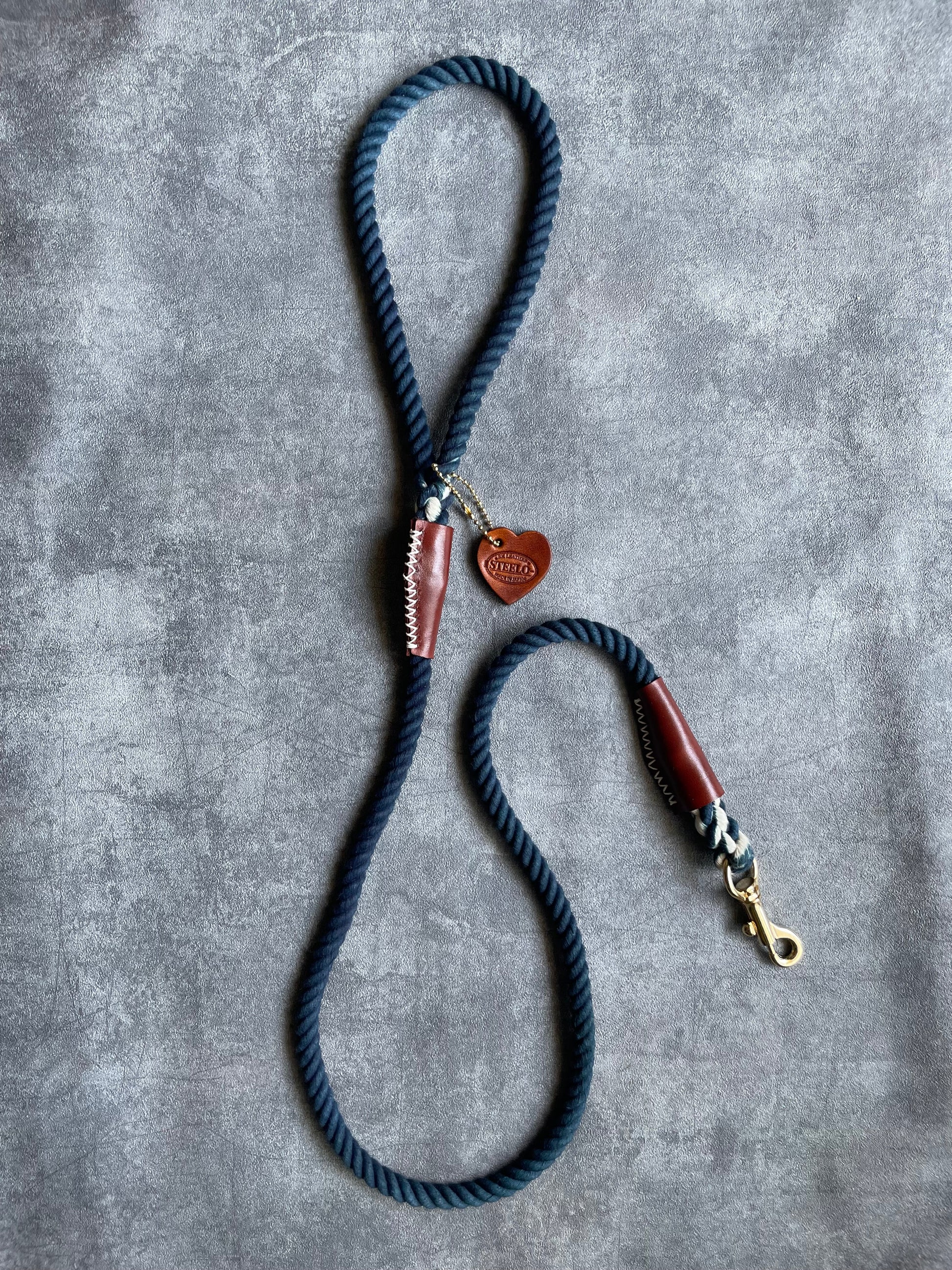 ネイビー×ブラウンレザーは販売当初から人気のデザイン。手染めならではの深みのある色合いは愛犬とオーナー様を上品に引き立てます。ストックアイテム限定仕様のハートロゴチャーム付き。